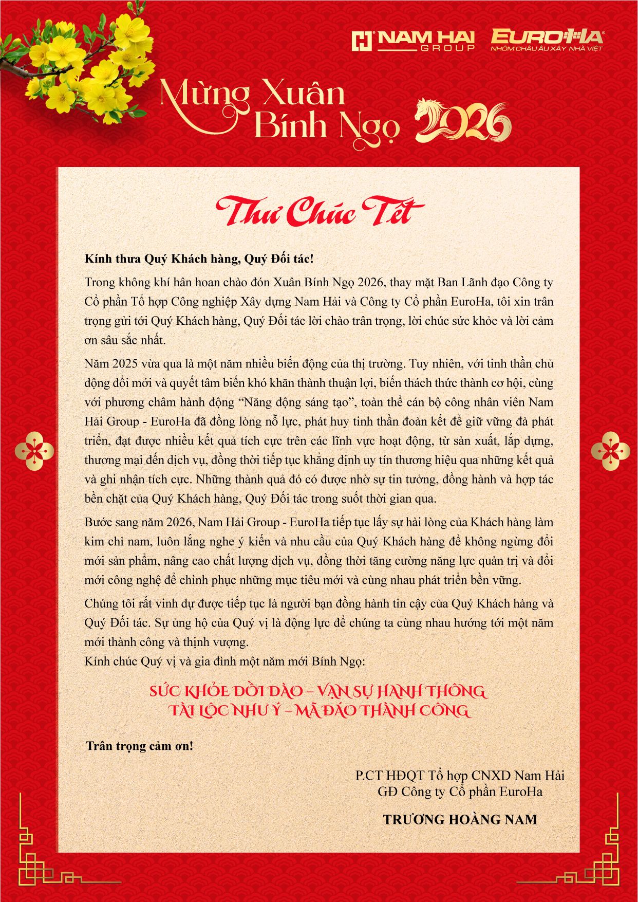 Kính thưa Quý Khách hàng, Quý Đối tác! Trong không khí hân hoan chào đón Xuân Bính Ngọ 2026, thay mặt Ban Lãnh đạo Công ty Cổ phần Tổ hợp Công nghiệp Xây dựng Nam Hải và Công ty Cổ phần EuroHa, tôi xin trân trọng gửi tới Quý Khách hàng, Quý Đối tác lời chào trân trọng, lời chúc sức khỏe và lời cảm ơn sâu sắc nhất. Năm 2025 vừa qua là một năm nhiều biến động của thị trường. Tuy nhiên, với tinh thần chủ động đổi mới và quyết tâm biến khó khăn thành thuận lợi, biến thách thức thành cơ hội, cùng với phương châm hành động “Năng động sáng tạo”, toàn thể cán bộ công nhân viên Nam Hải Group – EuroHa đã đồng lòng nỗ lực, phát huy tinh thần đoàn kết để giữ vững đà phát triển, đạt được nhiều kết quả tích cực trên các lĩnh vực hoạt động, từ sản xuất, lắp dựng, thương mại đến dịch vụ, đồng thời tiếp tục khẳng định uy tín thương hiệu qua những kết quả và ghi nhận tích cực. Những thành quả đó có được nhờ sự tin tưởng, đồng hành và hợp tác bền chặt của Quý Khách hàng, Quý Đối tác trong suốt thời gian qua. Bước sang năm 2026, Nam Hải Group – EuroHa tiếp tục lấy sự hài lòng của Khách hàng làm kim chỉ nam, luôn lắng nghe ý kiến và nhu cầu của Quý Khách hàng để không ngừng đổi mới sản phẩm, nâng cao chất lượng dịch vụ, đồng thời tăng cường năng lực quản trị và đổi mới công nghệ để chinh phục những mục tiêu mới và cùng nhau phát triển bền vững. Chúng tôi rất vinh dự được tiếp tục là người bạn đồng hành tin cậy của Quý Khách hàng và Quý Đối tác. Sự ủng hộ của Quý vị là động lực để chúng ta cùng nhau hướng tới một năm mới thành công và thịnh vượng. Kính chúc Quý vị và gia đình một năm mới Bính Ngọ: SỨC KHỎE DỒI DÀO – VẠN SỰ HANH THÔNG – TÀI LỘC NHƯ Ý – MÃ ĐÁO THÀNH CÔNG Trân trọng cảm ơn!